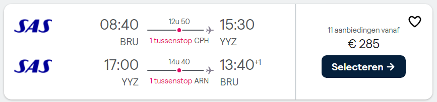 Maak een citytrip naar de bruisende stad Toronto aan Lake Ontario en bezoek de adembenemende Niagara watervallen. Door een promotie bij de luchtvaartmaatschappij SAS Scandinavian Airlines vlieg je nu goedkoop naar Toronto in Oost-Canada! Je vliegt nu voor maar €285 retour naar Toronto vanuit Brussel! Daarnaast zijn er ook goedkope rechtstreekse vliegtickets vanuit Parijs