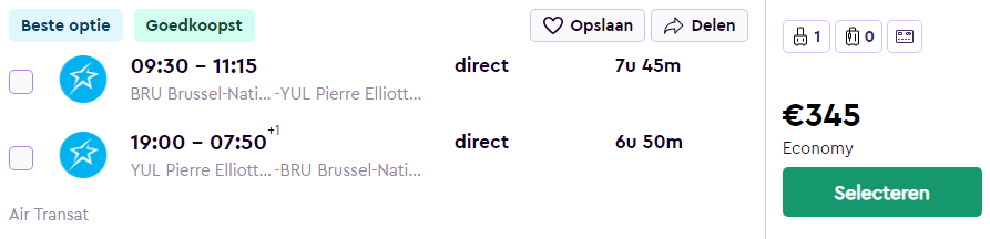 Andere voorbeelddata naar Montreal vanuit Brussel: