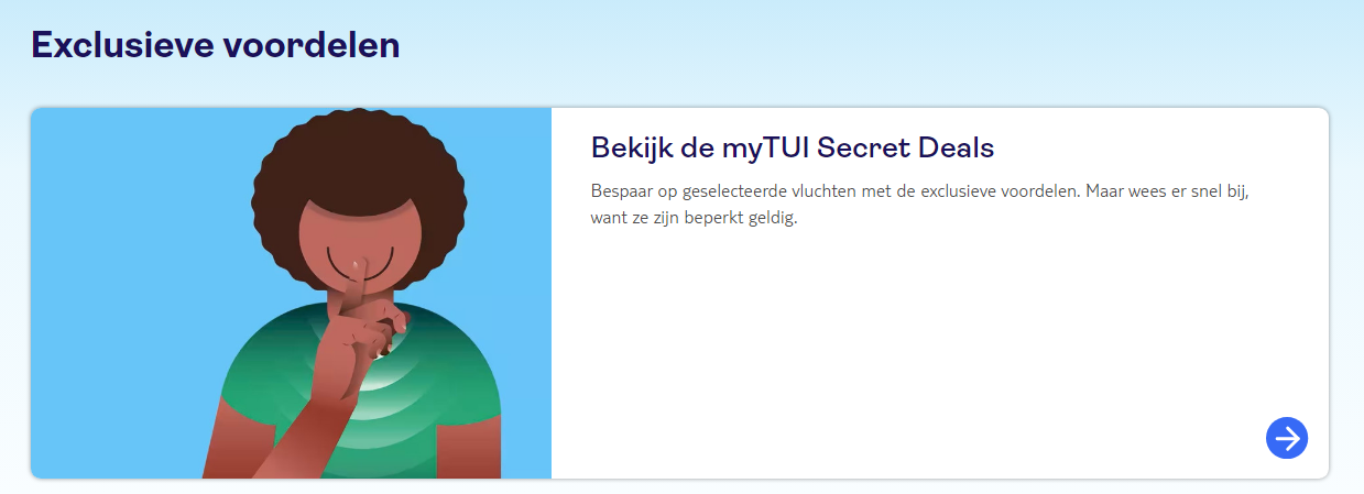 Deze Secret Deals korting kan je verkrijgen door in te loggen op jouw myTUI account op de TUI fly website. Vervolgens kan je klikken op “Bekijk aanbiedingen” of “Bekijk de myTUI Secret Deals” in jouw myTUI account om de toegang te krijgen tot de Secret Deals. Deze aanbieding is geldig t.e.m. 1 maart voor reizen tussen 1 april en 24 oktober 2024. Ook in de paasvakantie of zomervakantie kan je dus met korting boeken!